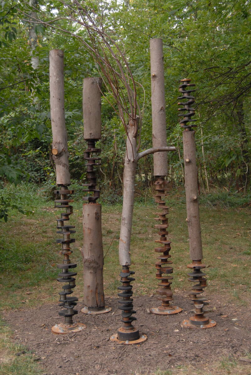 Top Left: found material - fallen timber, Center: wood construction - various types of dimensional lumber and metal, Right: multi-media - logs and metal, Bottom Left: top left site before